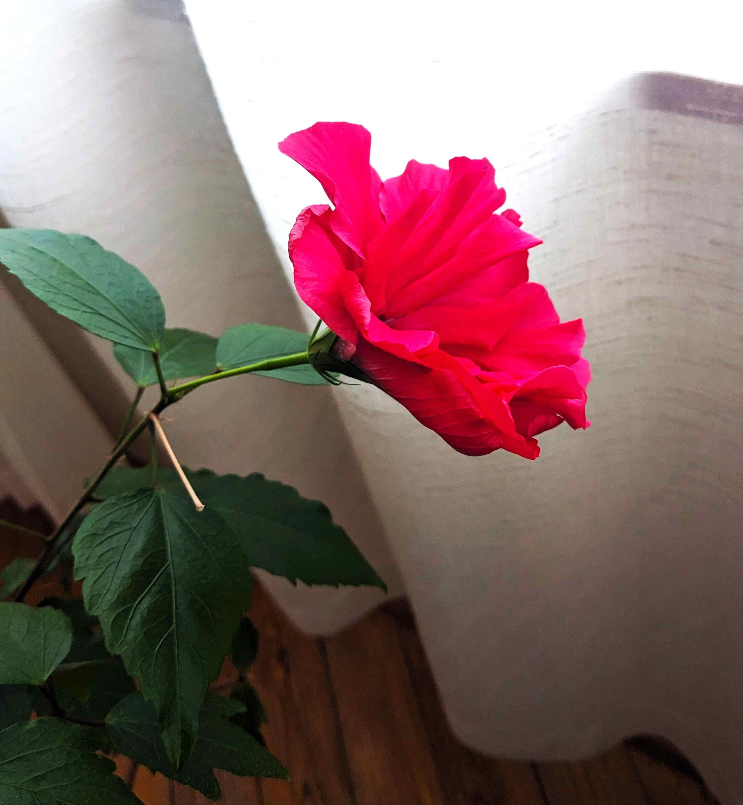 11.1,2026. Tämänaamuinen lahja kiinanruusulta: nuppu puhkesi kukkaan.